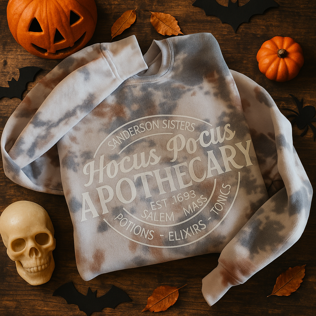 Get ready for spooky season with the Hocus Pocus Apothecary Crewneck! Featuring neutral tones perfect for mixing and matching, this cozy sweatshirt brings a touch of witchy charm without overwhelming your wardrobe. It’s ideal for those who want a subtle Halloween vibe while staying comfy and stylish all day long. Cast a comfy spell wherever you go!